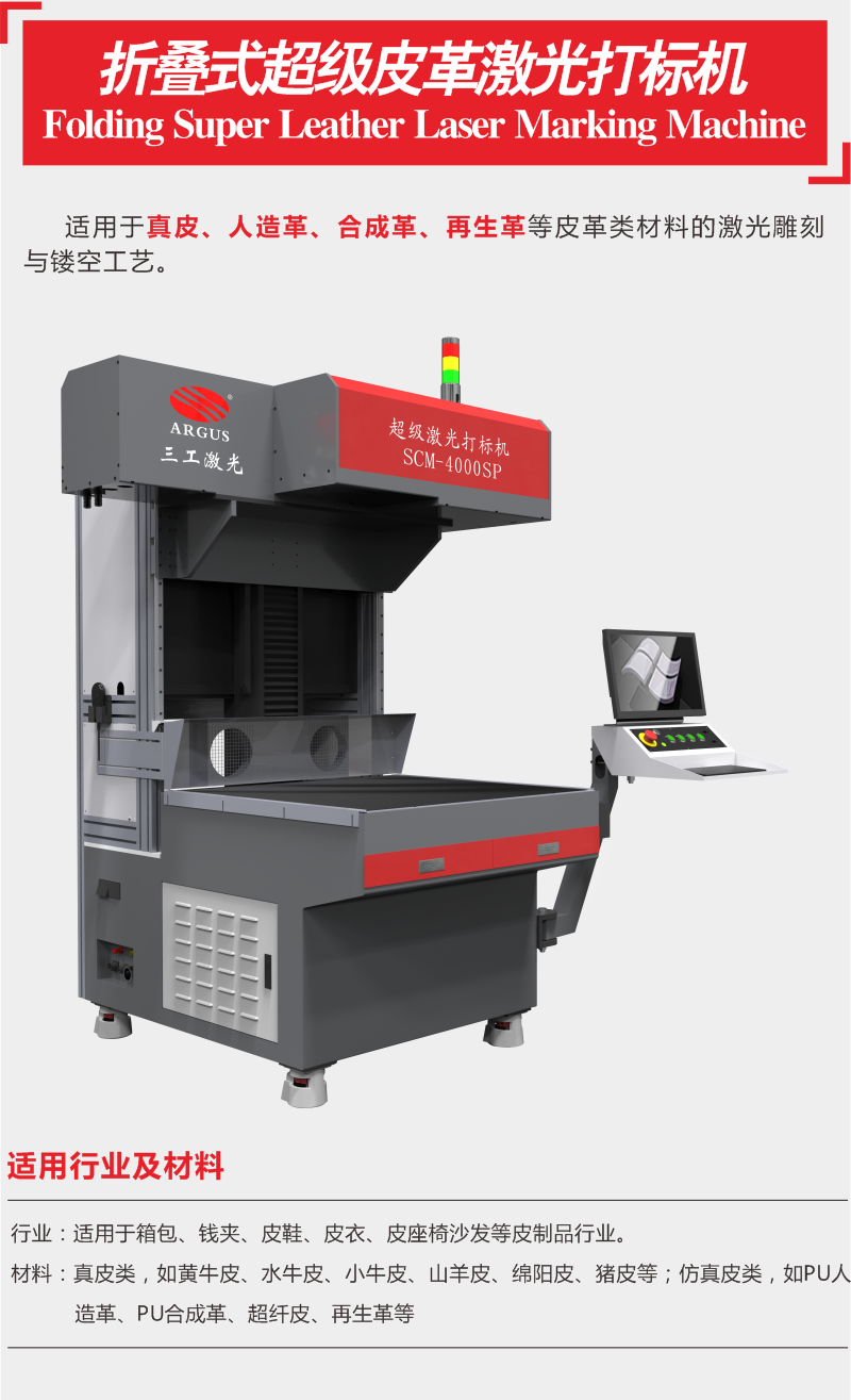 超级皮革激光打标机采用更高效稳定的振镜控制系统,振镜运动精度更高,加工微小字符图形更清晰,整机工作更稳定可靠。