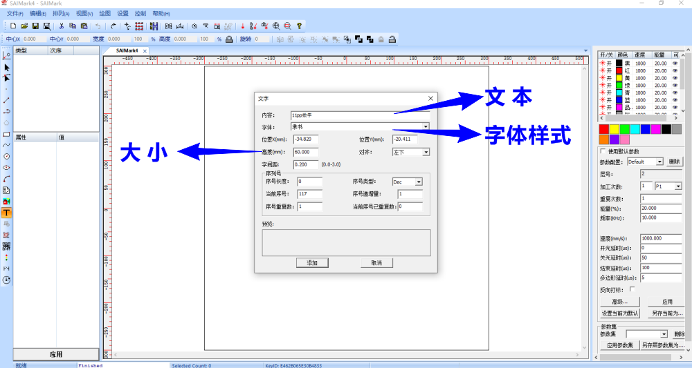 输入文本(包括数字、字母、文字等),选择字体样式、大小,再点击“添加”